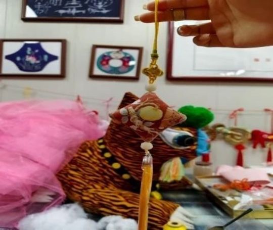 接下来将缝制好的布套翻面(正面朝外),把混合好的香料倒在一团棉花上,塞入香囊中,刘老师说这样可保留香气8-9年。最后用隐针法将预留的小口缝好,完成基本造型。最后添加装饰,系上彩绳、挂上流苏、缝上珠子以及刺绣吊坠等,让香囊更具观赏性。