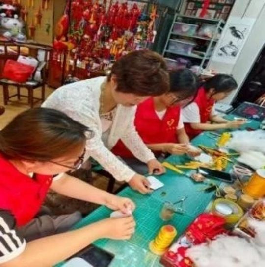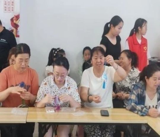 在团队成员学会制作香囊的方法后,大家揣着满当当的热情、带着对传统文化的好奇与向往与刘老师一同前往合阳县城关镇关雎社区,与当地邻里聊非遗故事,做暖心香囊。在炎炎夏日里,在欢声笑语中,大家共聚一堂,大学生志愿者们与村民的互动成为最动人的篇章。社区的桌面上有提前为大家准备好的布料、丝线和香料,旁边也有非遗传承人刘老师指导以及大学生志愿者们随时帮忙。大家一边跟着刘老师学那些藏在针脚里的老手艺,一边和叔叔阿姨们聊聊小时候见过的香包样式;叔叔阿姨们也露两手,教教同学们怎么缝得更工整、怎么配色更雅致,互相搭台、彼此学习,让这一针一线都带着 “传帮带” 的暖意。其中不少老人感慨:“多少年没见过这样的手艺了,年轻人能想着传承这些,真好!”