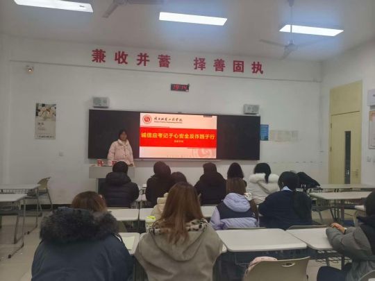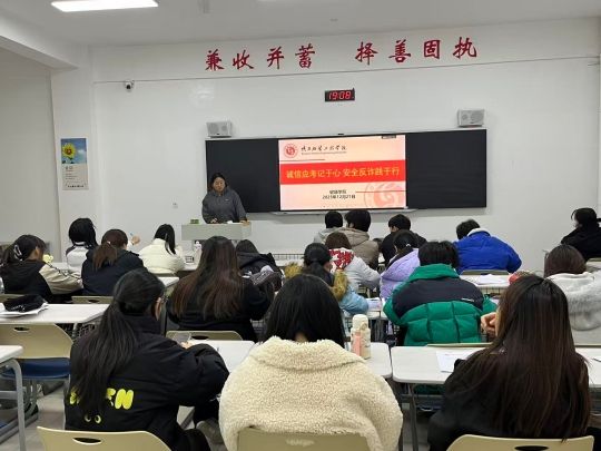 班会过程中,师生互动环节气氛热烈。学生们结合自身见闻分享反诈经历,就备考中遇到的问题向老师请教,辅导员则针对期末复习规划给出建议,强调合理安排时间、劳逸结合的重要性,同时提醒学生在备考之余关注自身安全,远离校园不良网贷,保护好个人财物与信息安全。教室墙上“兼收并蓄,择善固执”的校训标语,也成为本次班会的精神注脚——择“诚信”“安全”之善,方能行稳致远。