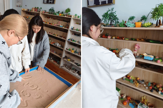 随后,同学们走进沙盘游戏室,在赵老师的引导下,开启了一场与自我的深度对话。沙箱里,细腻的沙粒承载着同学们的情绪与想象;置物架上,丰富的沙具等待着被赋予意义。