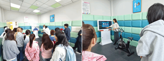 为了让同学们用更具活力的方式释放压力,心理咨询室的宣泄区成为了大家的“情绪出口”。在这里,同学们体验了智能动感单车,屏幕上的虚拟赛道与骑行节奏同步,大家在蹬踏中追逐目标,在速度与激情里,将学业的焦虑、生活的烦恼统统抛在脑后。