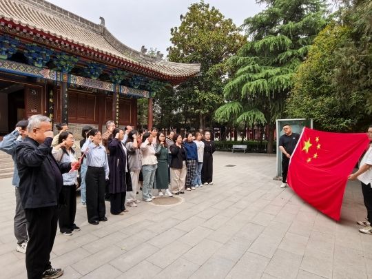 参观结束后,由院长霍科科教授领誓,全体教师面向国旗庄严宣誓。铿锵有力的誓言回荡在祠内,彰显出新时代人民教师坚守教育初心、恪守师德规范、潜心教书育人的坚定决心。