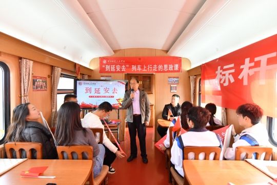 移动课堂启程,红色专列上的思政课。列车甫一开动,“移动思政课堂”随即开讲。校长助理罗文谦以“延安十三年”历史脉络为主线,将瓦窑堡会议、党的七大等重大事件娓娓道来。车厢内红旗漫卷、标语醒目,学子们聆听记录、互动问答,围绕“延安精神的时代价值”展开热烈讨论。“在奔赴延安的路上感悟延安精神,仿佛与历史同频共振”,一位同学的感言道出了大家共同的心声。