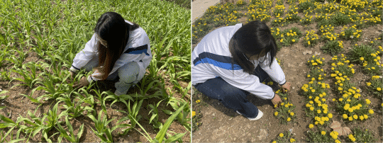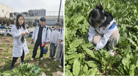 随后,党员教师分组开展实操教学,手把手指导学生辨识中草药外观特征,传授科学采摘技巧,同步讲解蒲公英清热解毒、茵陈清热利湿等药用价值,让学生在实践中做到 “识百草、知药性”。实践过程中,学生党员积极请教、互帮互助,认真记录实操要点,老师积极引导大家思考中草药知识与群众健康服务的结合路径,为后续便民服务奠定基础。